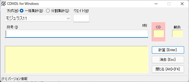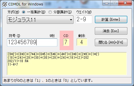 | モジュラス11 | ウエイトの範囲を「2-9」のように入力してください。この場合、符号の下1桁の加重係数が2、その上が3となり、9となった次の桁は2になります。 | 一括集計か分割集計かを選択してください。 | 旧ISBNや地方自治体コードなどで使用されています。あまりが0または1の場合のチェック・ディジットは、規格により異なる場合があります。このツールでは、あまりが0のときは「1」を、1のときは「0」をチェック・ディジットとしています。 |