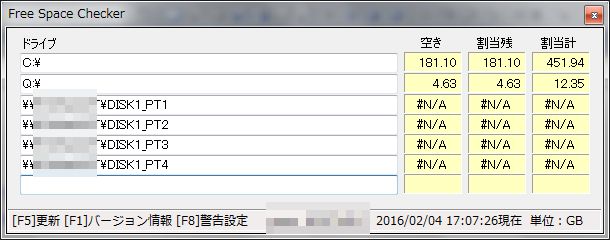 空きがあらかじめ指定しておいた値(警告)を下回ると、表示が薄黄色から薄赤色に変わり、同時に通知領域のアイコンが警告の表示に変わります。警告の値は、ウィンドウが表示されている状態で[F8]を押すと入力できるようになります。