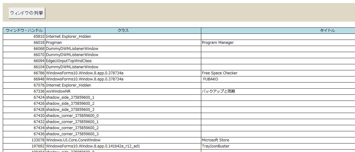 ▼シート「可視ウィンドウのクラス名、タイトルを列挙」・・・開いているウィンドウのクラスとタイトルの一覧を作成します。